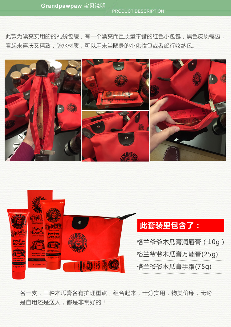 番木瓜万用膏 : 天然番木瓜萃取精华,Manuka麦卢卡蜂蜜20+,葵花籽油,绵羊油,蜂蜡。 番木瓜万能手霜 : 番木瓜萃取精华,Manuka麦卢卡蜂蜜20+,绵羊油, 维它命E。